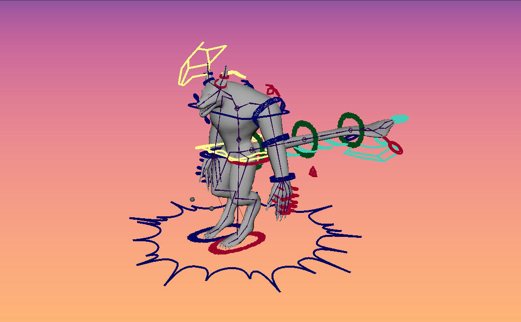 It was fun to create a rigg with two different characters combined into one. I wanted to be able to have the two characters interact with each other. I put down a little extra love and care to my controllers for this rigg. I felt like the controllers gave me some inspiration to what I could to do for animations.