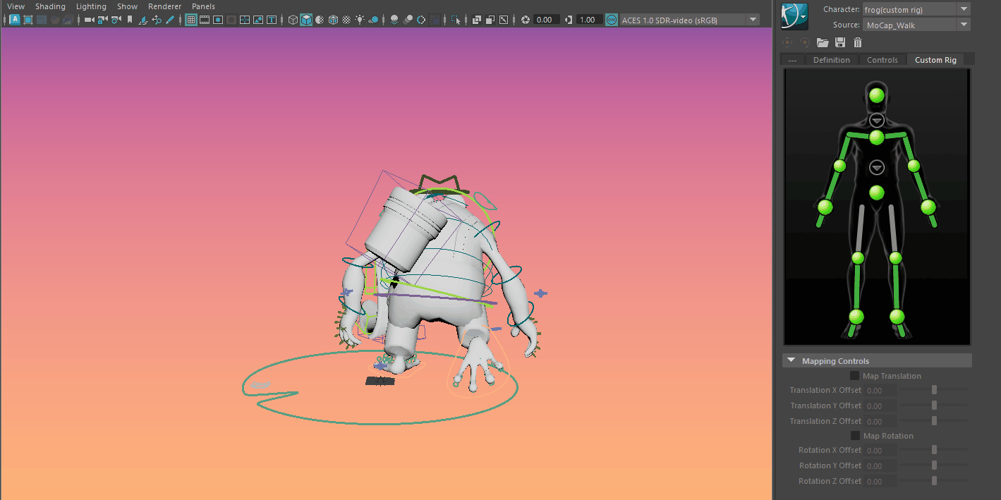 Same goes with the set up for the main character the Frog. Most of all animations is motion captured for the enemy as well but some clean up had to be made in Maya. We added wings and an extra pair of arms to the character so some key frame animations needed to be added to the character.