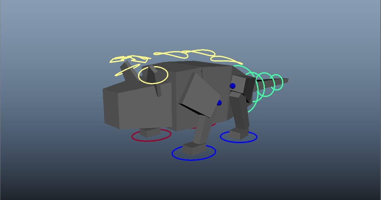 I worked together with a fellow classmate to create a quadraped rigg for the player character for this project. I worked on the animations for the Rat and an enemy robot.